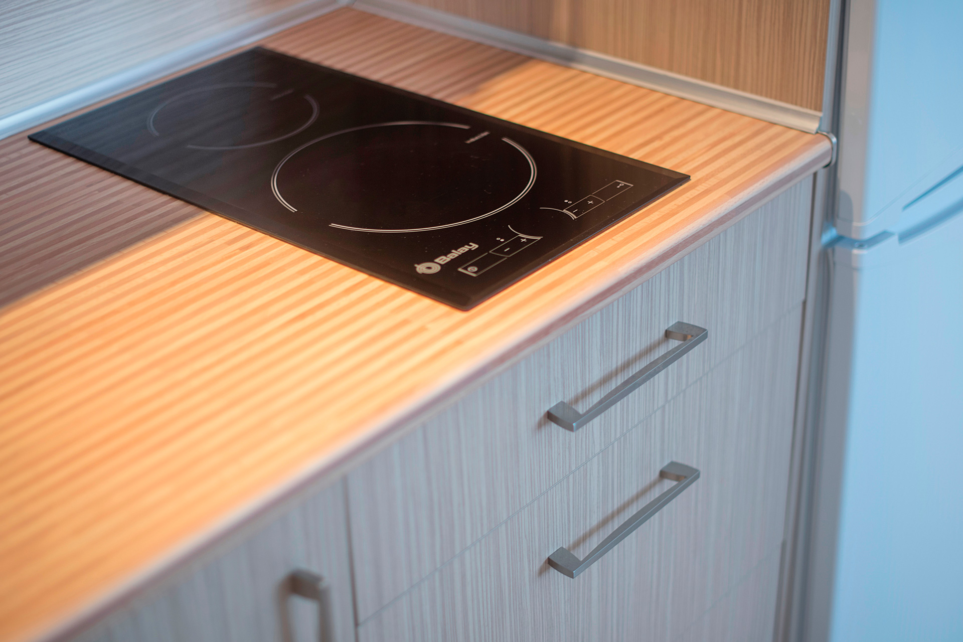 Gaudeix de més espai i confort en aquest estudi de 33 m² amb balcó francès i llit Queen Size (180×200) equipat amb topper viscoelàstic. La zona d’estar disposa de sofà de pell de dues places, menjador i TV de 32″, tot controlat domòticament. La cuina estå totalment equipada amb electrodomèstics d’alta gamma (incloent rentadora) i el bany compta amb una àmplia dutxa d’obra arran de terra amb ventilació natural i amenities prèmium.